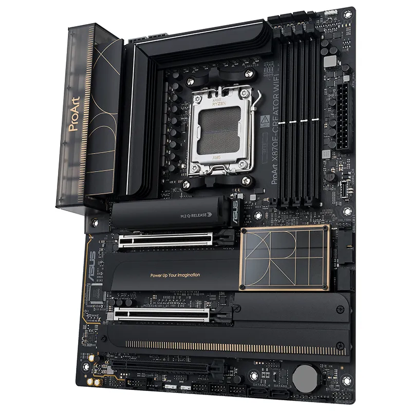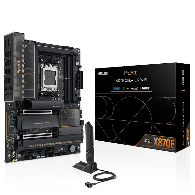 The ProArt X870E-Creator WiFi empowers creators of all levels by maximizing the performance of the latest AMD Ryzen™ 9000, 8000 and 7000 Series processors with 16+2+2 team power stages, DDR5 slots, PCIe® 5.0 and lightning-fast connectivity including dual USB4®, 10G and 2.5G Ethernet, and WiFi 7.​