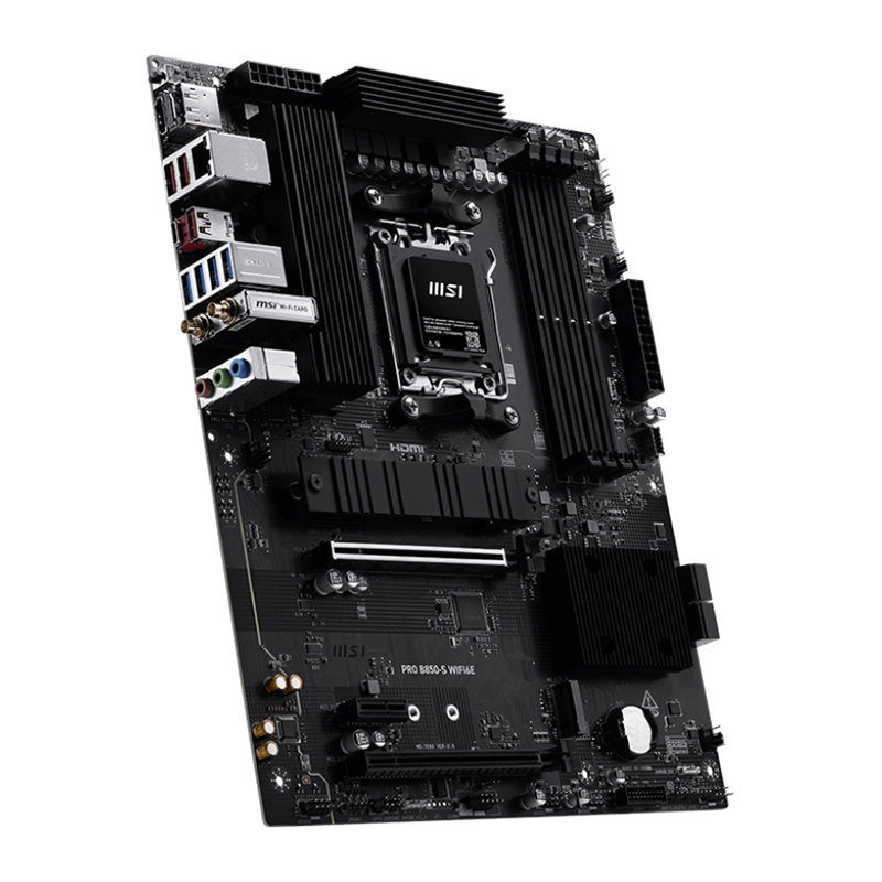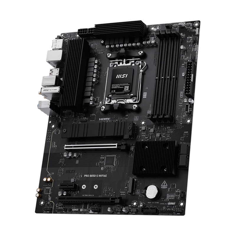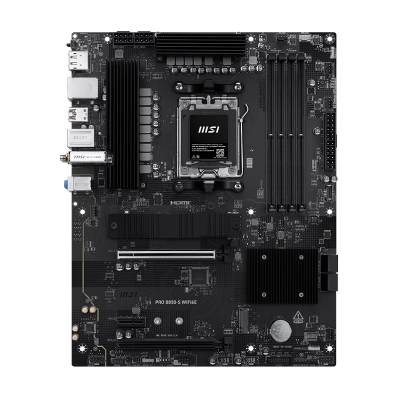 PRO B850-S WIFI6E offers a simple design with a harmonious color scheme that perfectly matches black PC builds. It is engineered with many exclusive features of MSI, a Wi-Fi 6E with EZ Antenna, 2.5G LAN, and PCIe 5.0 M.2 with M.2 Shield Frozr, ready for the AMD Ryzenâ„¢ 9000 series processors.