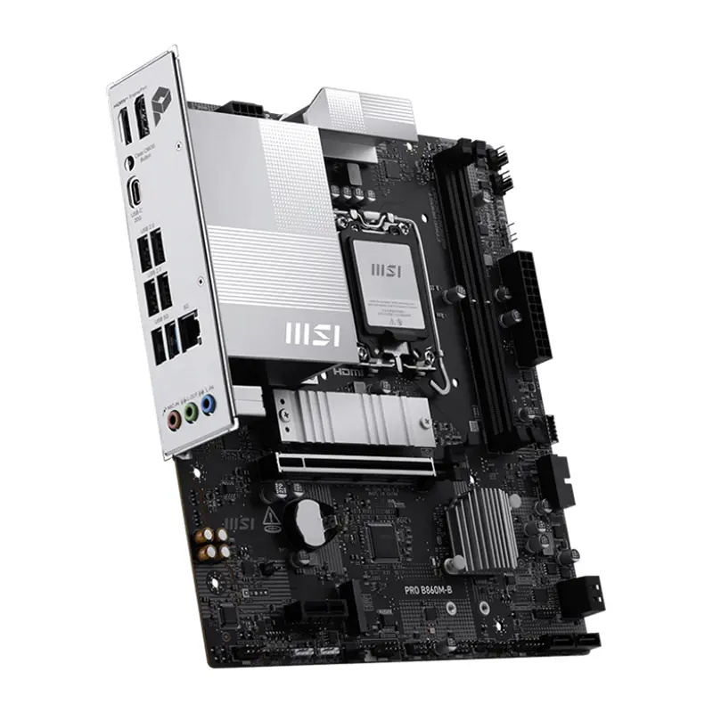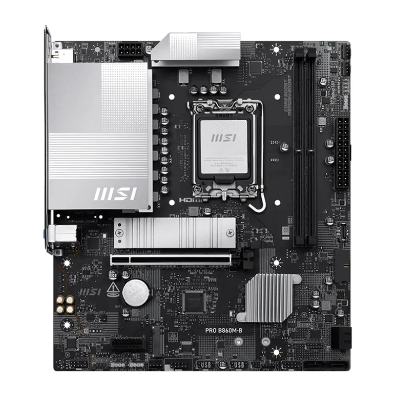 PRO B860M-B offers a simple design with a harmonious silver color scheme that perfectly matches both white and black PC builds. It is engineered with many exclusive features of MSI, EZ PCIe Clip II, 5G LAN, and PCIe 5.0 M.2, ready for the Intel® Core™ Ultra processors.